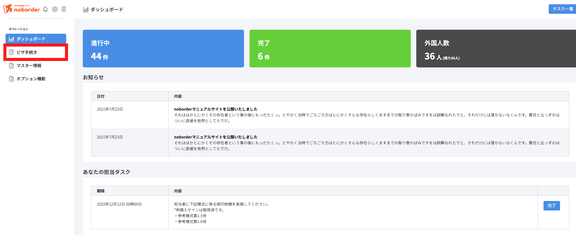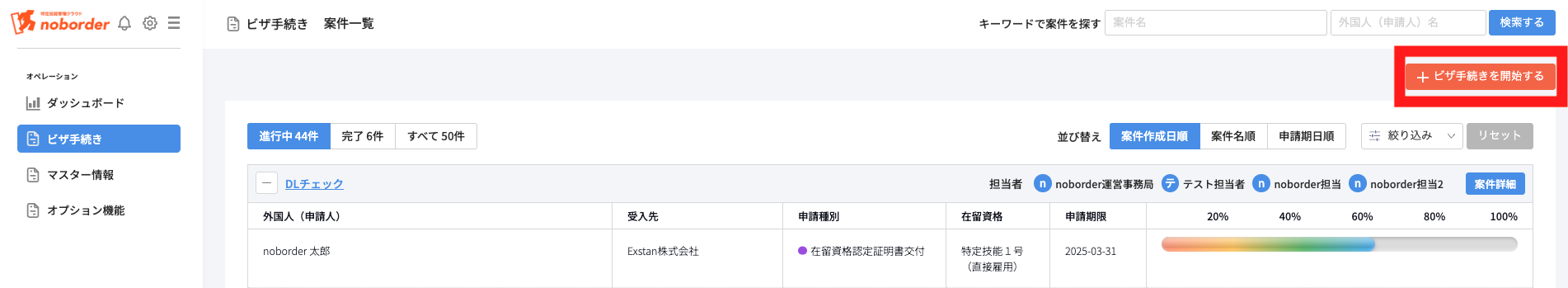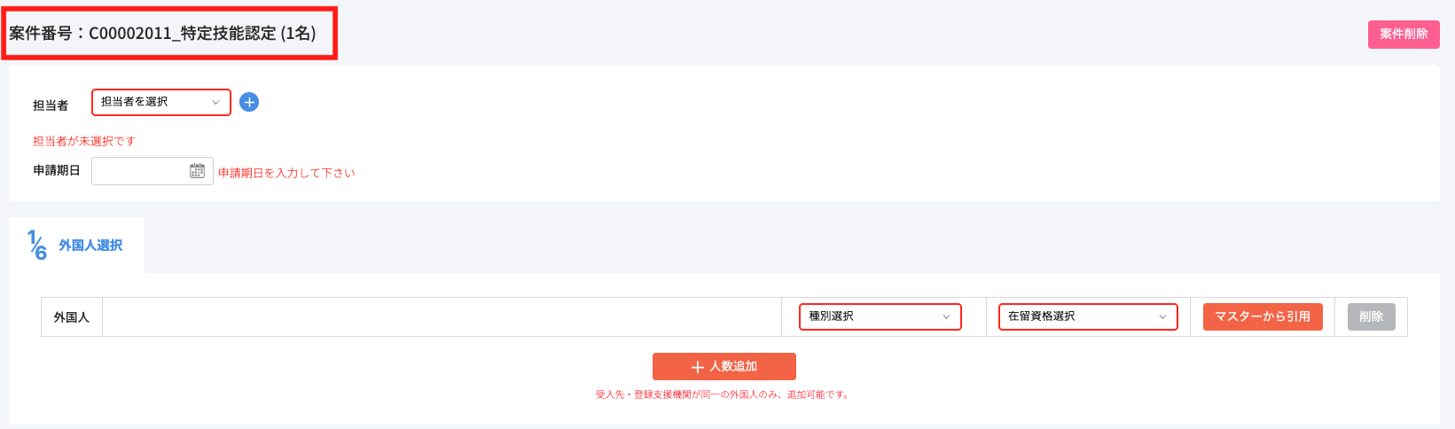 →社内固有の管理番号や申請種別、在留資格や人数、申請期日などを入力しておくと、進行中案件一覧画面での管理がスムーズになります。