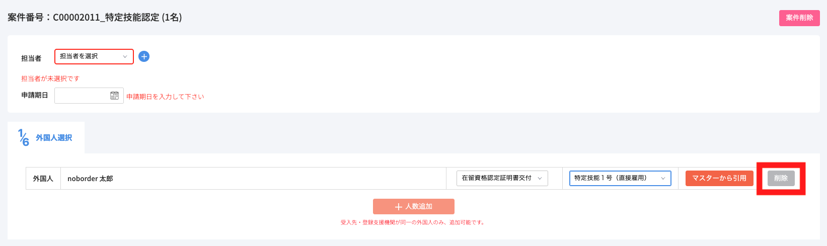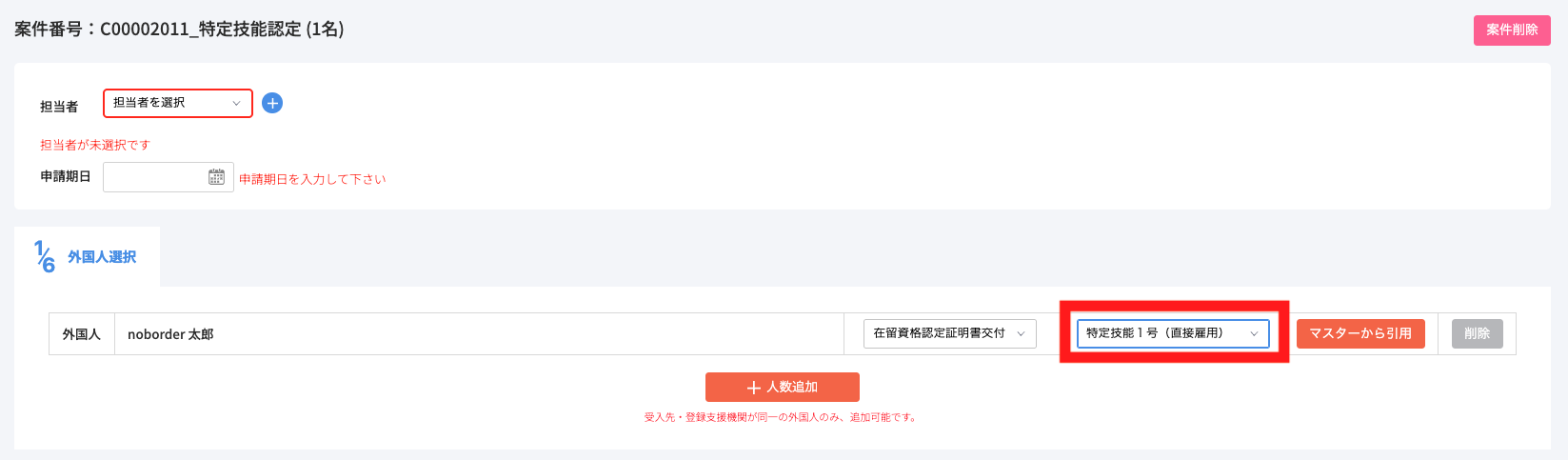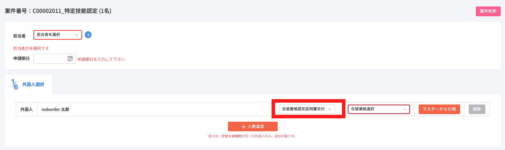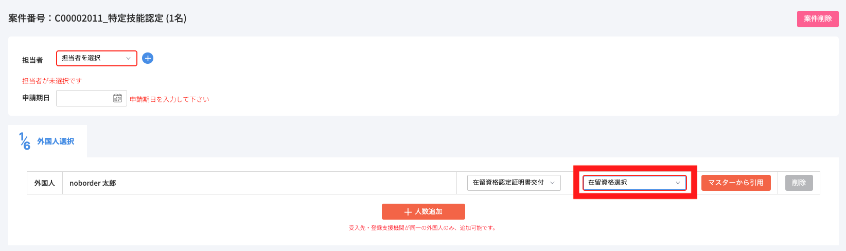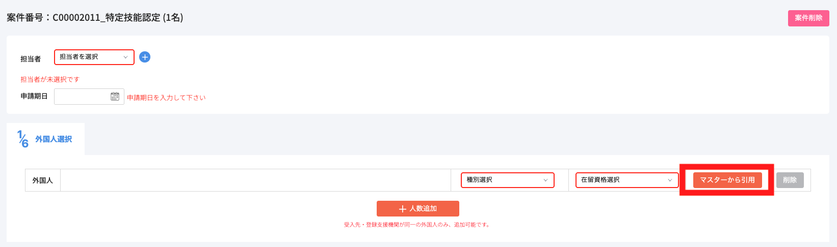 →受入先と支援情報を予め設定していない外国人は、マスターから引用することができません。