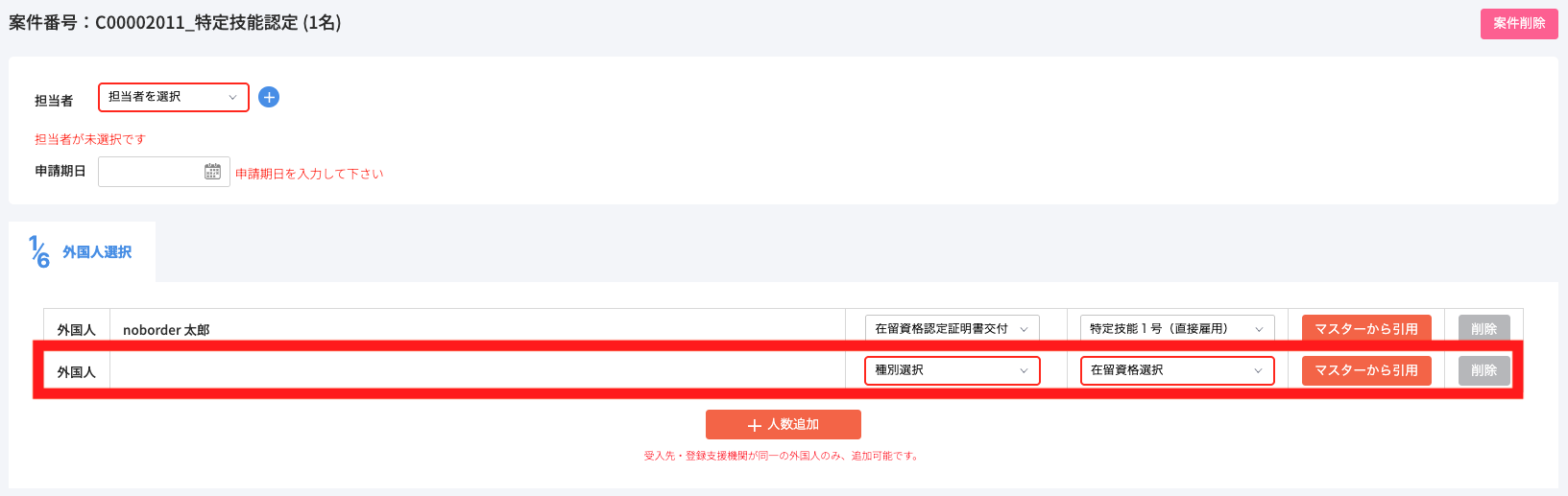 →1人目に選択した外国人と異なる受入先・支援情報の場合は、マスターから引用することができません。