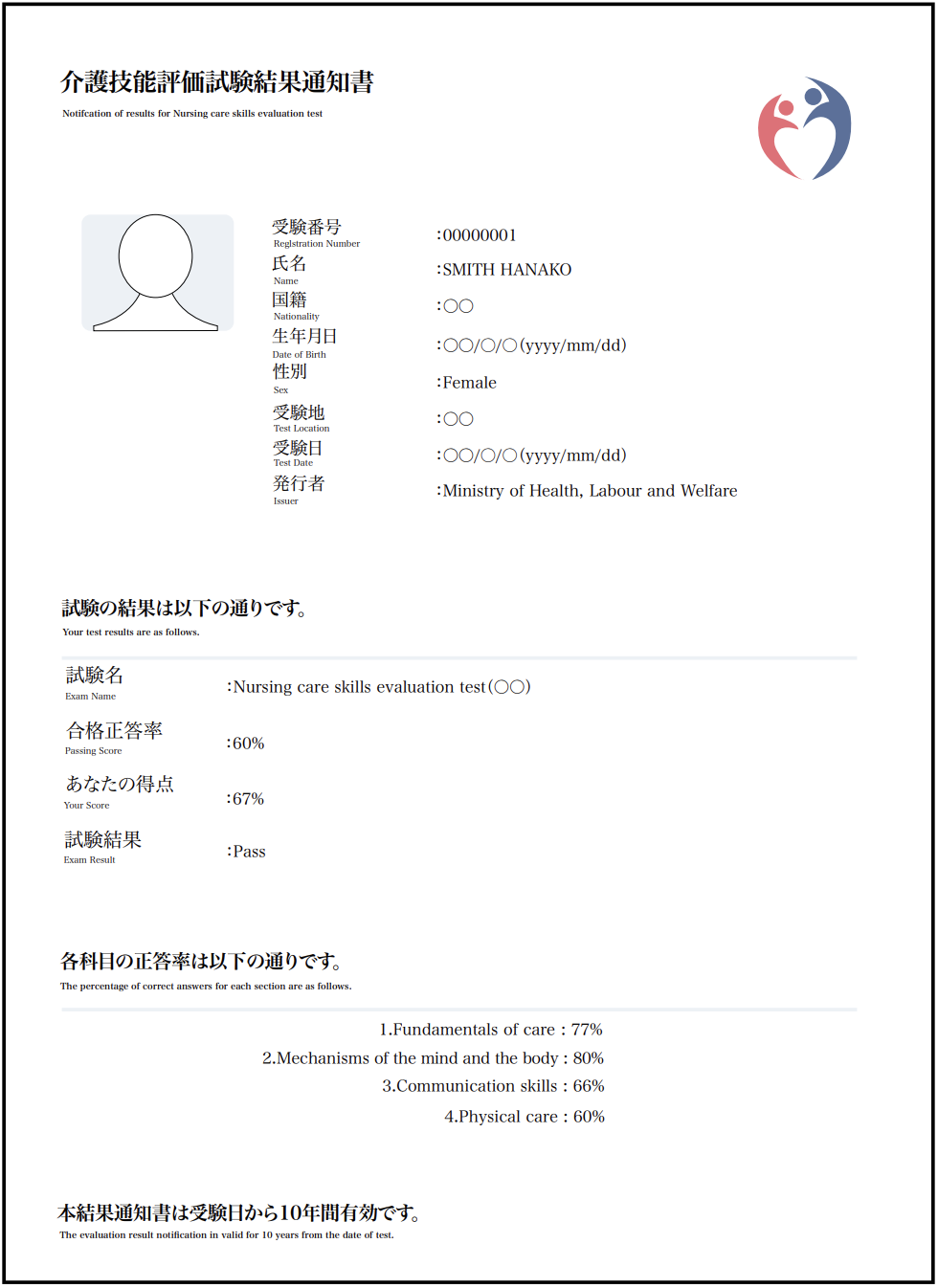 (特定技能1号)介護技能評価試験の合格証明書コピー