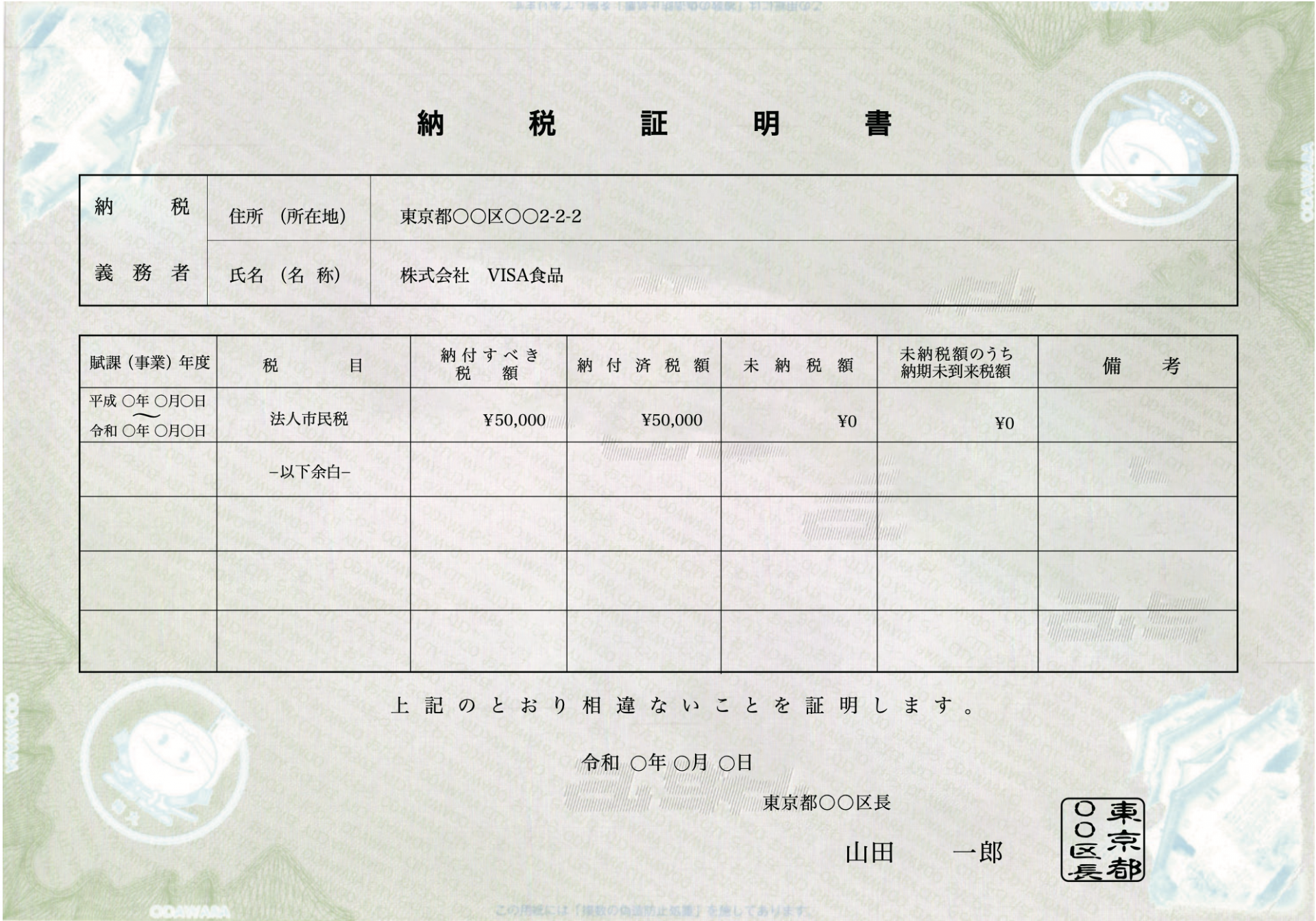 いずれかの条件に該当していること ・一定の事業規模があり、適正な受入れを行うことが見込まれる機関 ・過去2年以内に提出済みの場合 (申請(予定)日時点でも労働保険料等、社会保険料、税のいずれについても滞納がない) ・社会福祉法人等、法人住民税の発行がされない場合 |