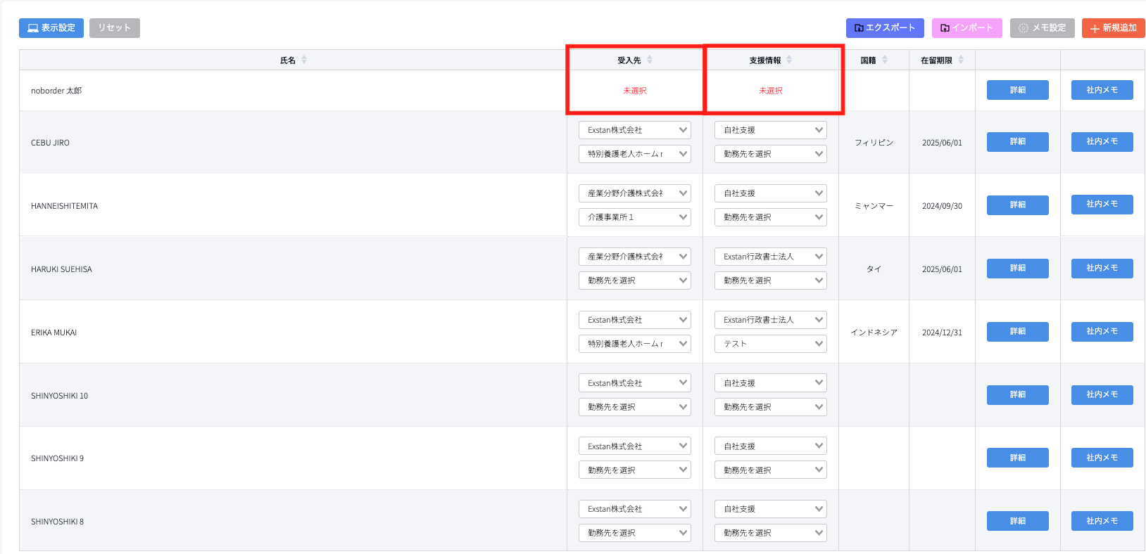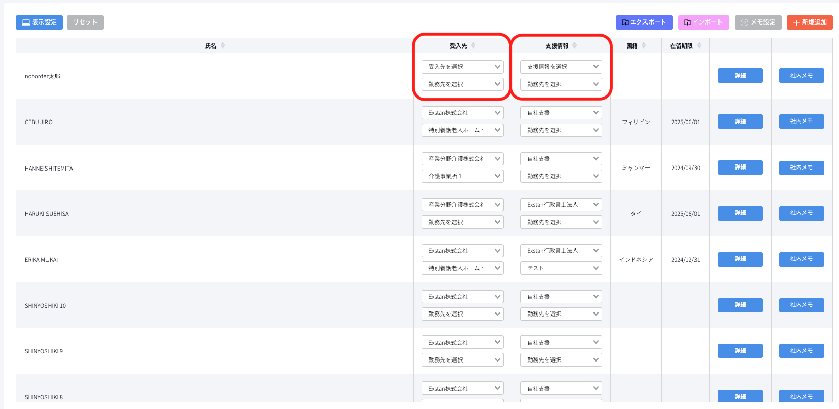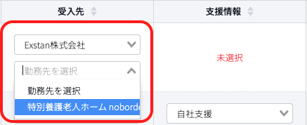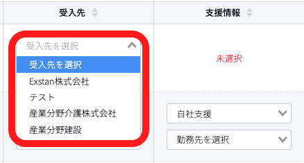 一覧表示画面でも、受入先・勤務先情報、支援情報と外国人材の紐付けが可能です。
