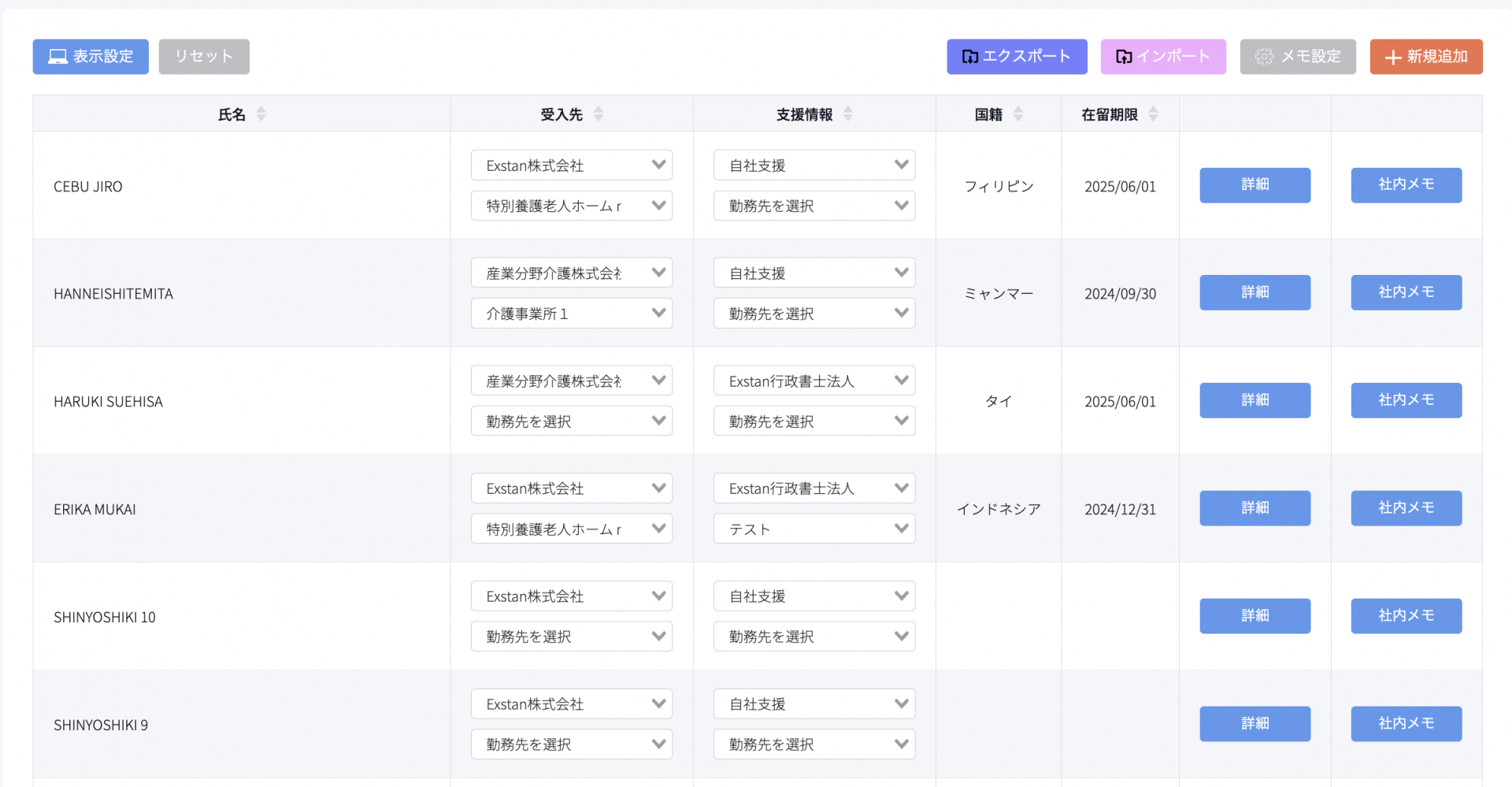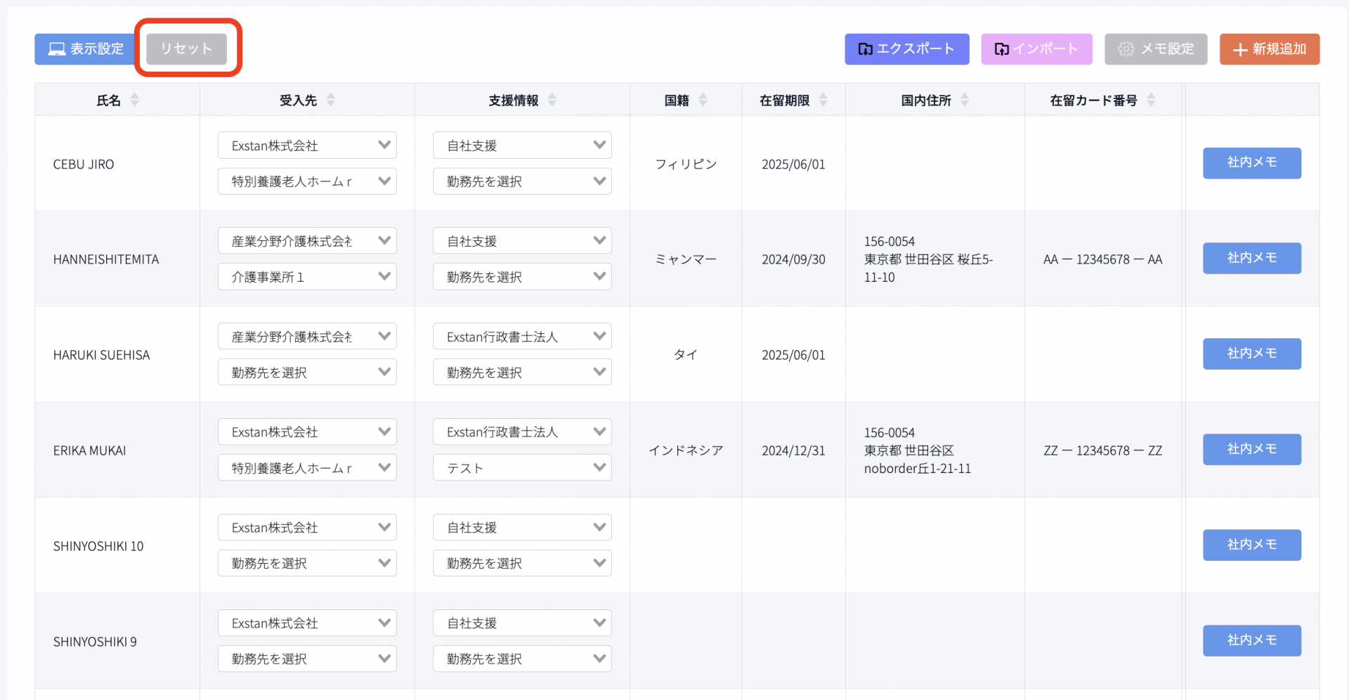 追加した項目は非表示となり、デフォルト項目 (氏名、受入先、支援情報、国籍、在留期限)が表示されます。