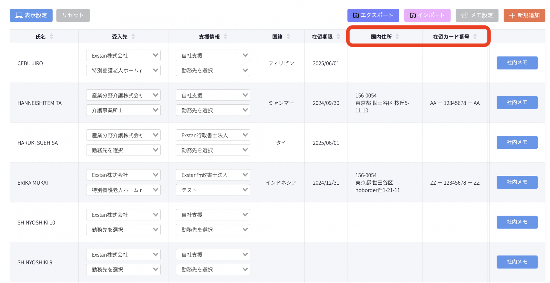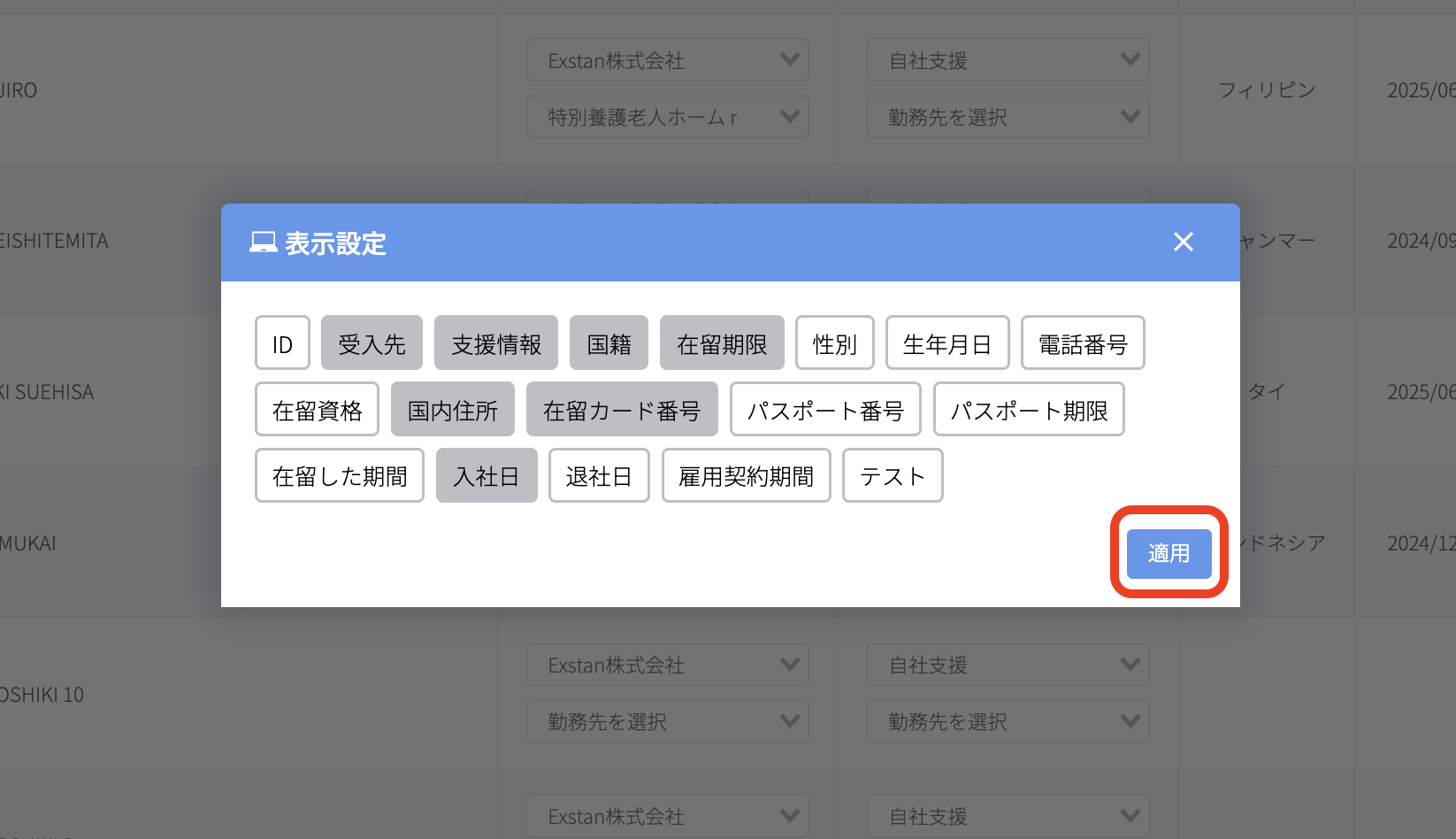 *初期設定は「受入先」、「支援情報」、「国籍」、「在留期限」です。