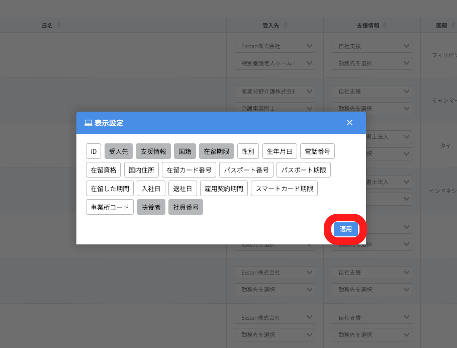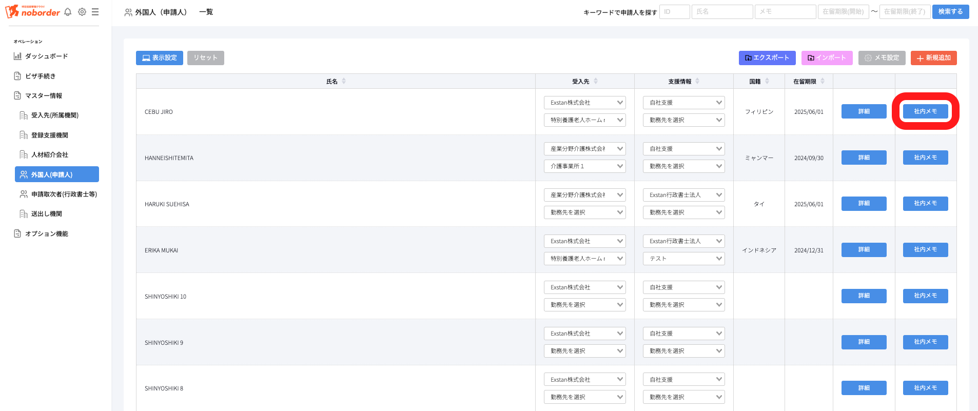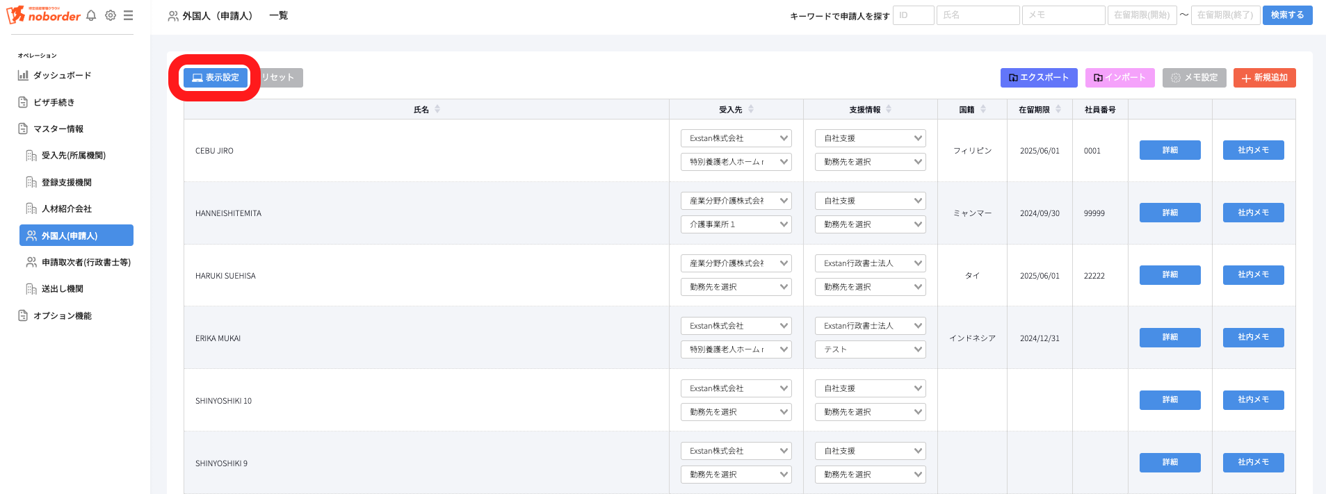 マスター外国人(申請人)一覧に戻ると、適用した項目が表示されます。
