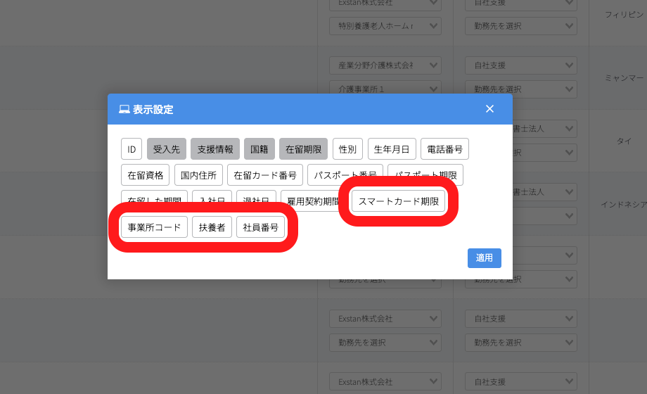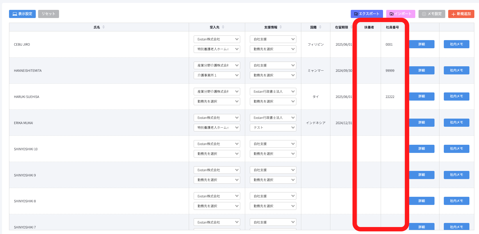 *本画面では社内メモ「扶養者」、「社員番号」を選択の上、適用しました。
