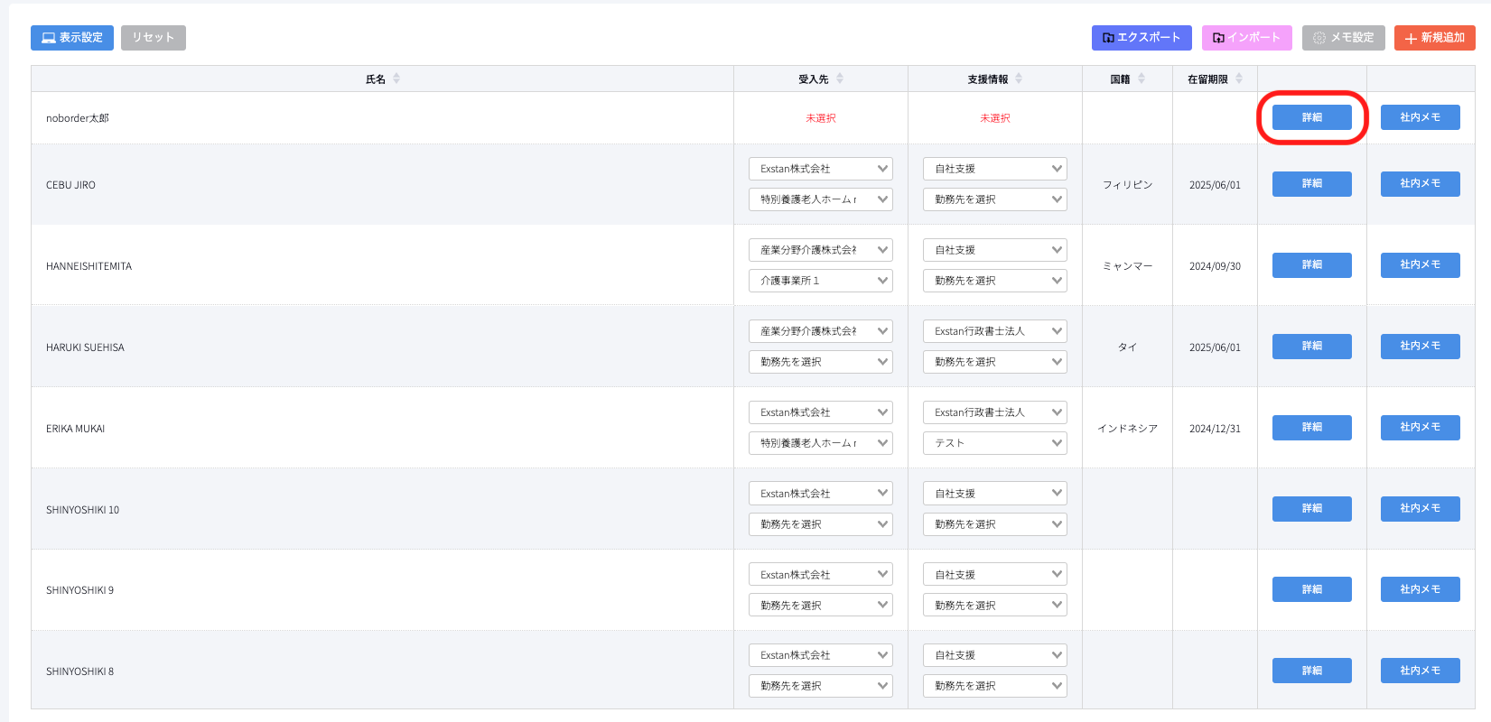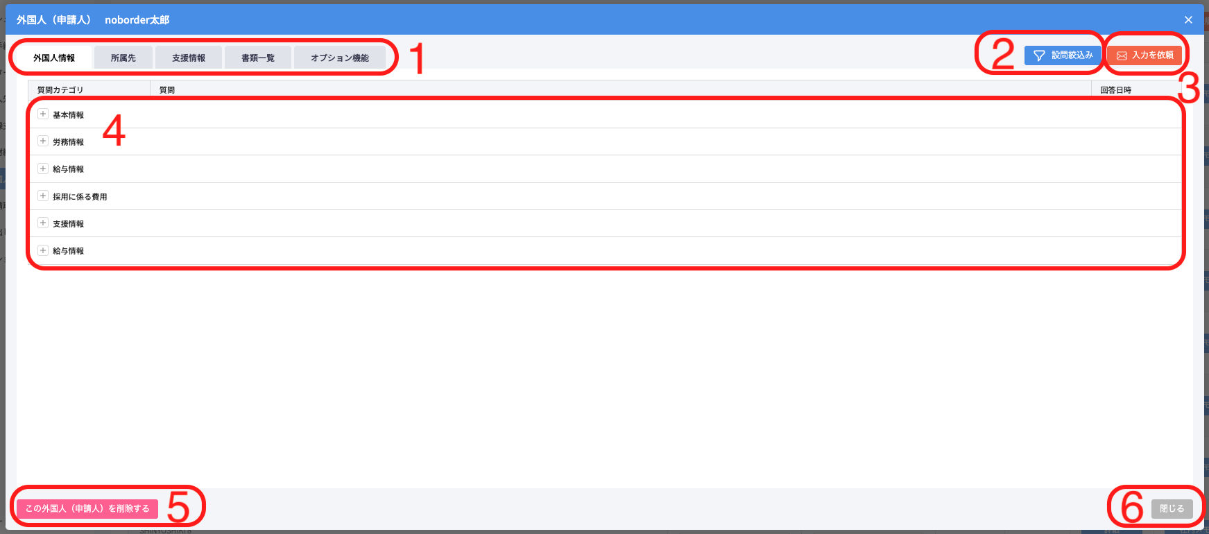 詳細:外国人情報タブ 所属先タブ 支援情報タブ 書類一覧タブ オプション機能タブ