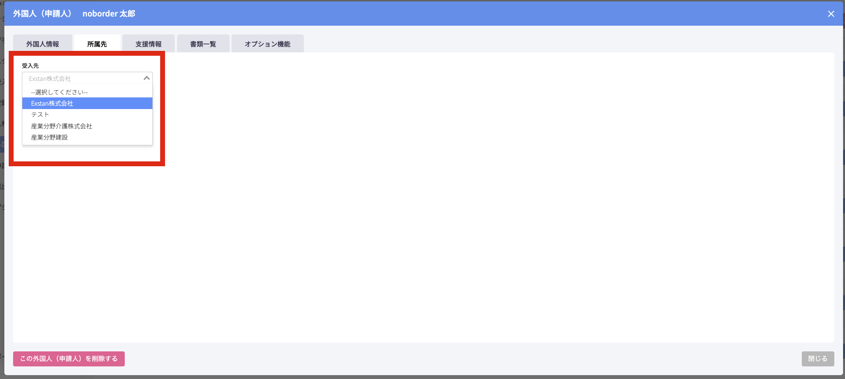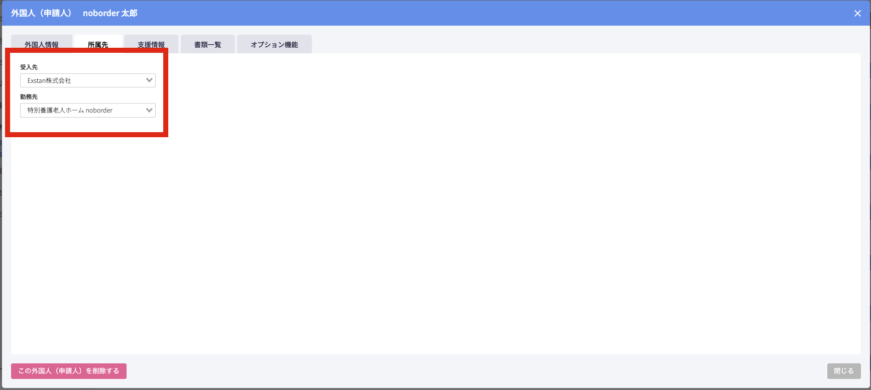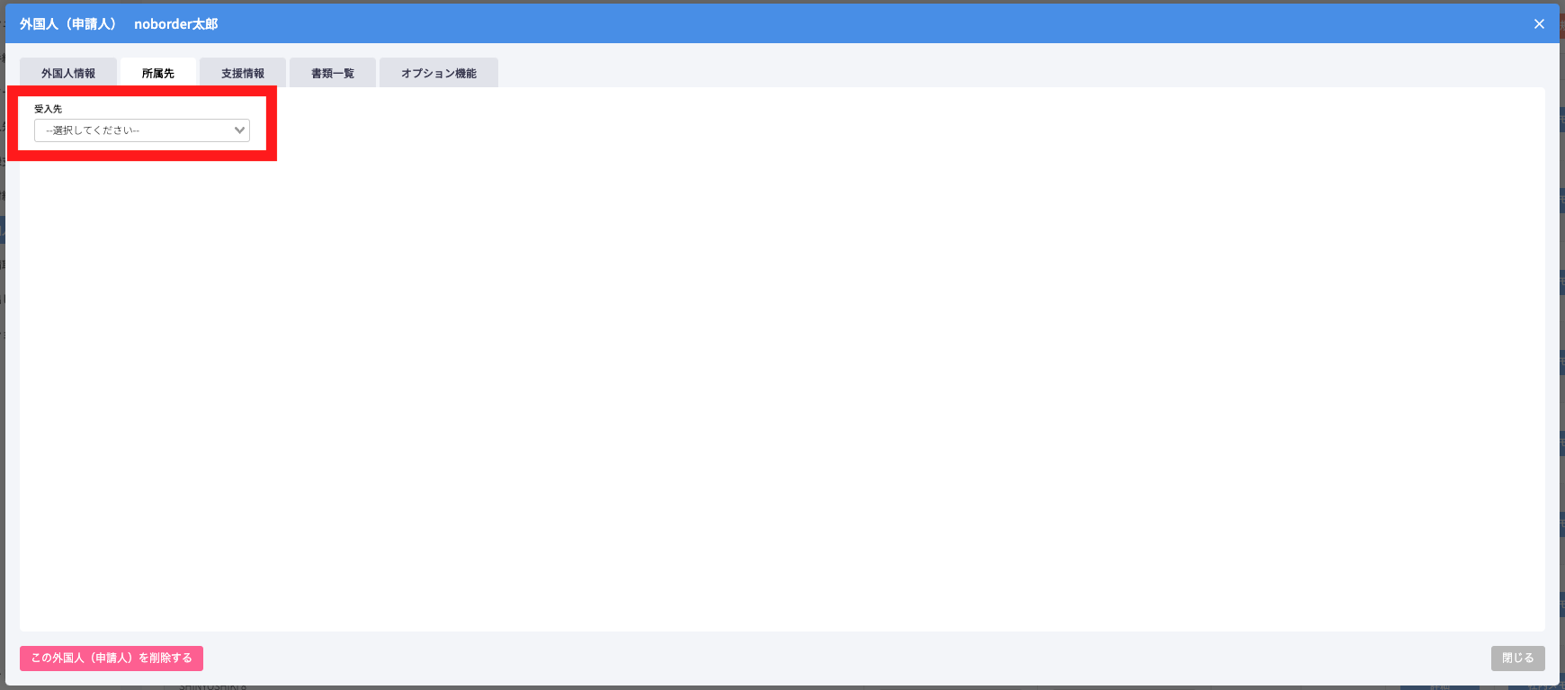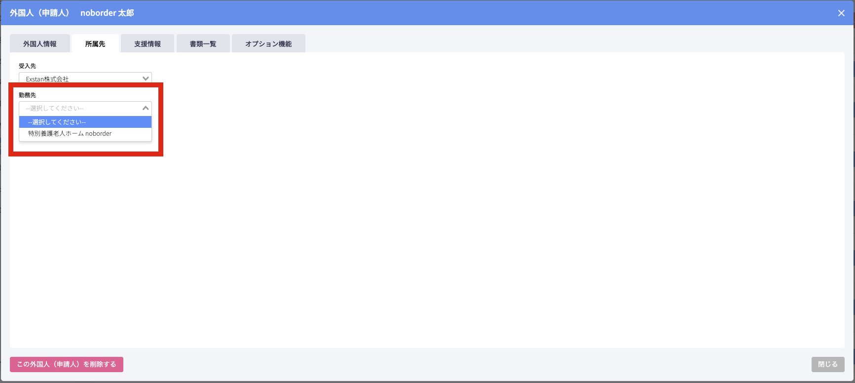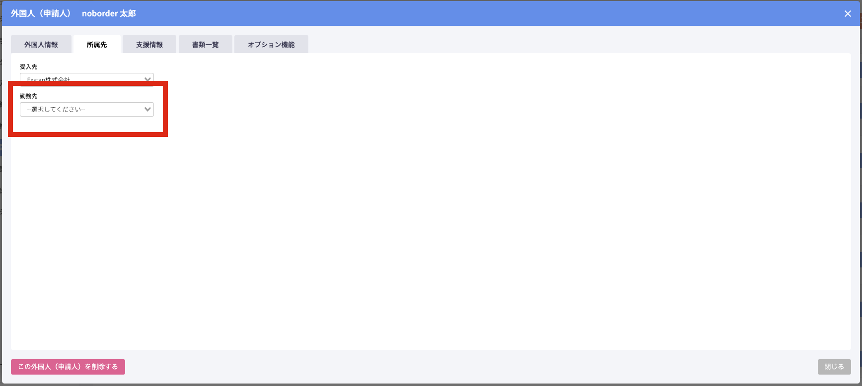 受入先の選択が完了すると、勤務先プルダウンが表示されます。