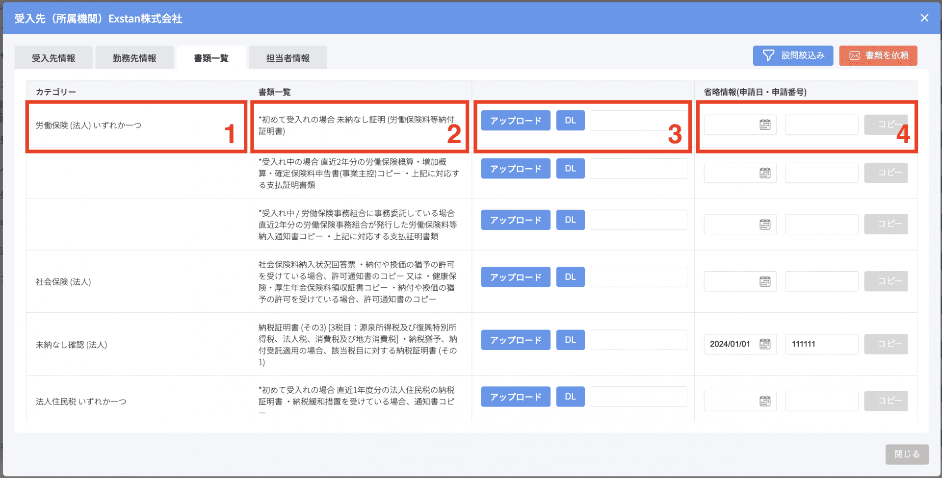 書類項目ごとの省略根拠となる申請日、申請番号が入力可能です。