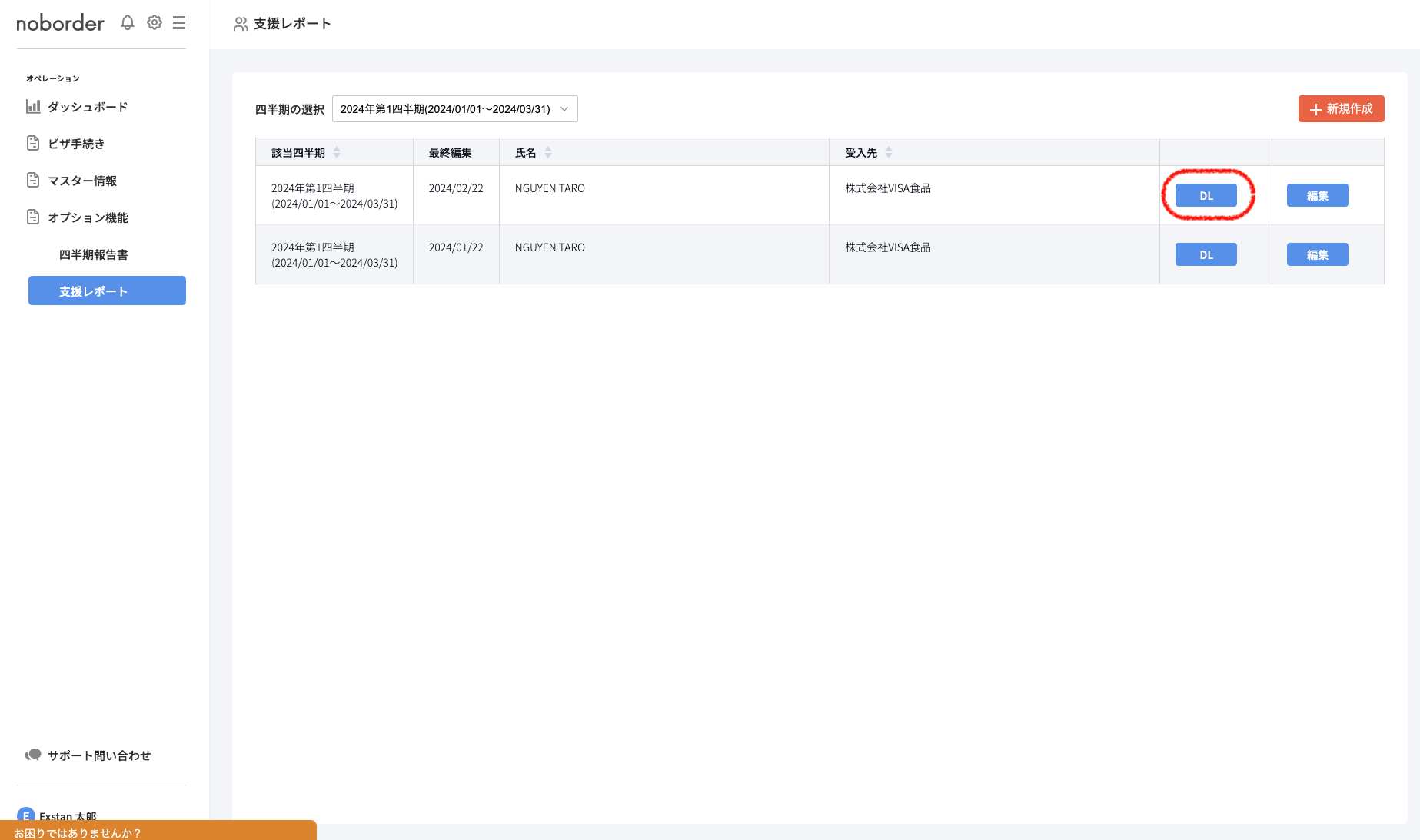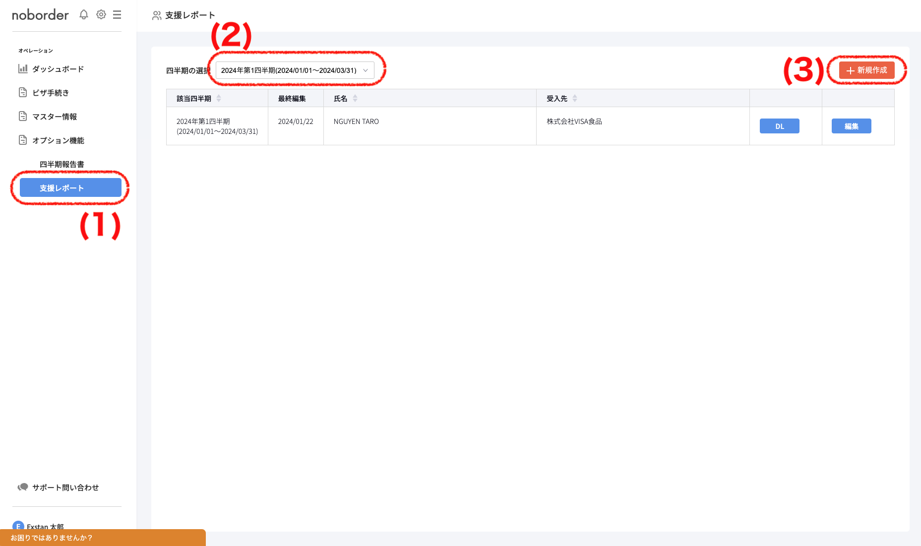 (1) オペレーション「支援レポート」をクリックします。