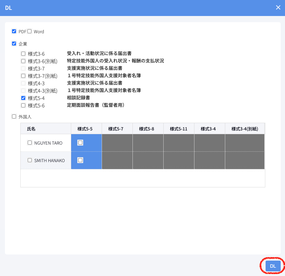 必要な書類の項目□を選択し、「DL」をクリックします。