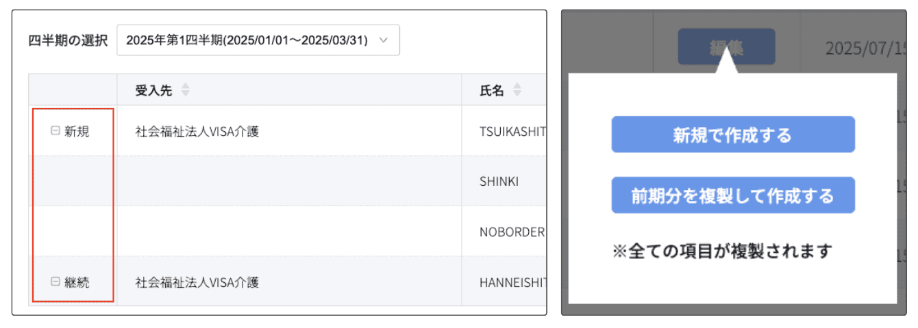→継続の場合には、「新規で作成する」か「前期分をコピーする」かお選びいただけます。 ※一回きりの表示となりますので、誤操作にはご注意ください。